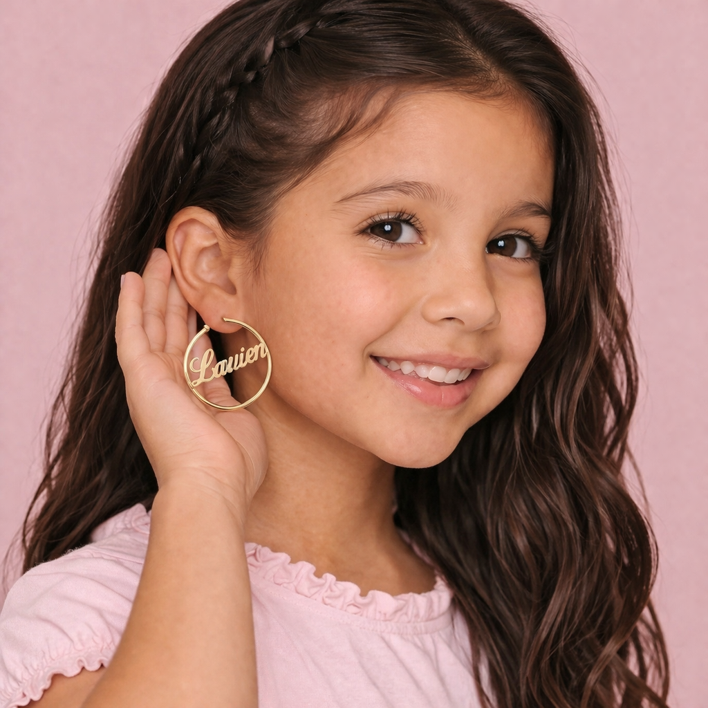 Personalisierte Ohrringe mit dem eigenen Namen sind bei Kindern beliebt. Sie sind ein modisches Must-have. Unterstreichen Sie Ihre Persönlichkeit und Ihren einzigartigen Stil. Ein schönes Geschenk für ein Kind, einen Freund oder das Kind eines Freundes.