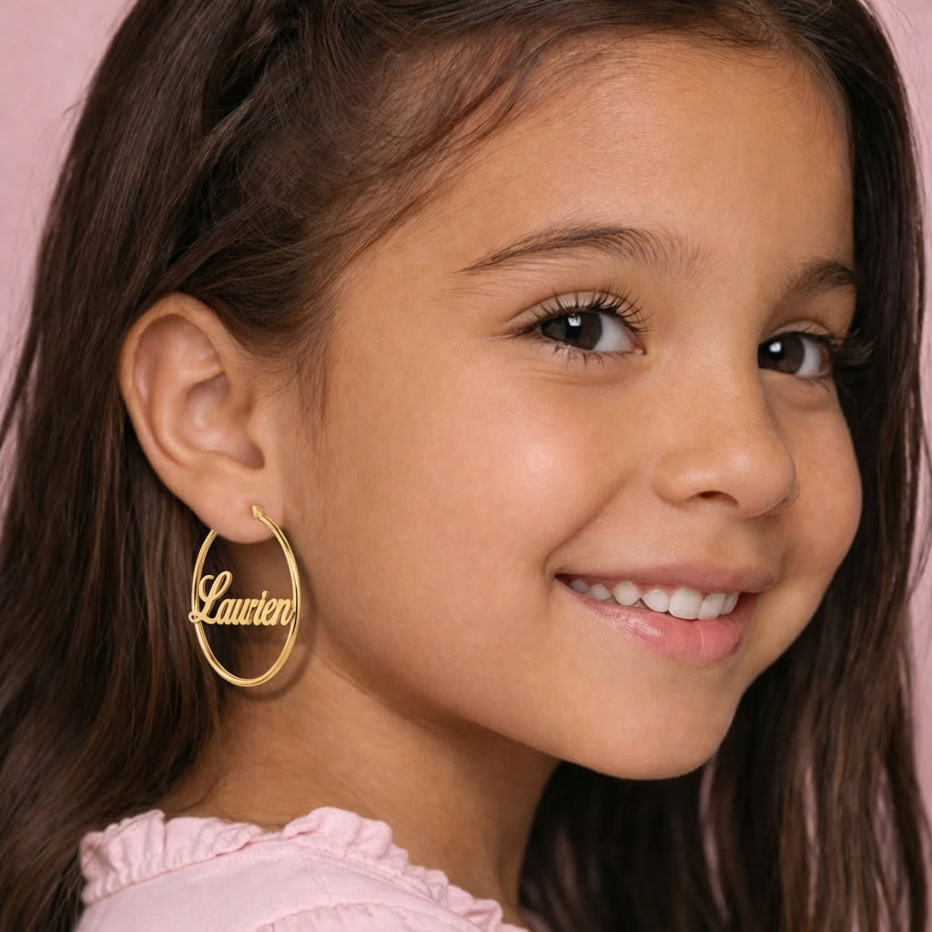 Hypoallergene, personalisierte Creolen mit Kindernamen für kleine Mädchen