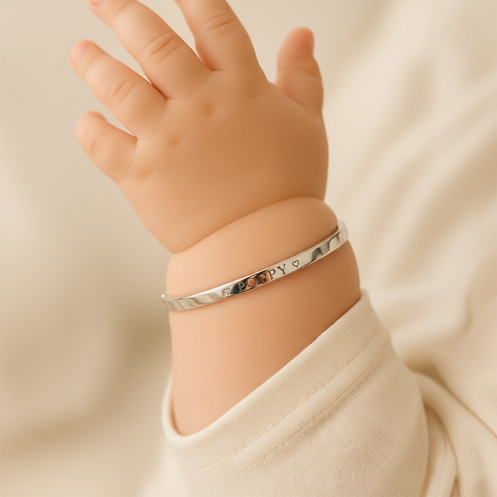 Each bangle can be custom engraved with your child’s name, initials, or a meaningful date — creating a cherished piece that symbolizes love and connection.