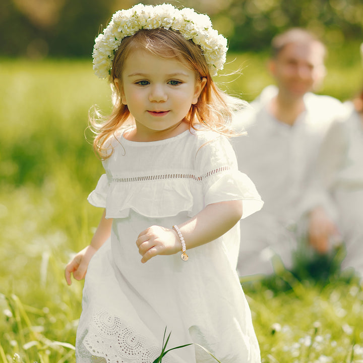 Elevate your child's jewelry collection with our exquisite Personalized Pearl and Cross Bracelet, a timeless piece inspired by classic elegance. Pearls symbolize purity, which is the same as the essence of your beloved child. With an adorable initial disc pendant and a delicate cross pendant, this bracelet is perfect for children's christenings, baptisms, birthdays, or as a cherished flower girl accessory for weddings. Beautiful gift box included with purchase.